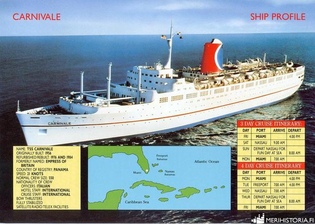 Ruttkarta i Karibien med tidtabell för 3 och 4 dygns kryssningar från Miami till Freeport respektive Nassau.