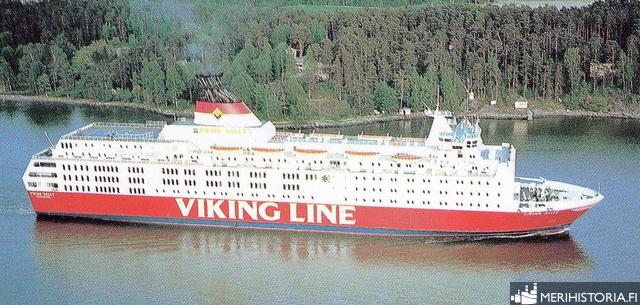 Rederivykort med text (som symboler) på baksidan: m.s. VIKING SALLY 2000 personer 370 personbilar 1200 bäddar VIKING LINE Stockholm - Mariehamn - Turku/Åbo.