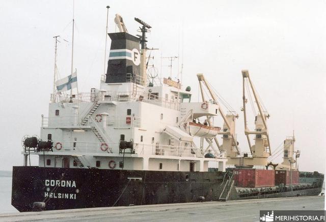 MS CORONA avgångsklar från Fredrikshamn till Lissabon (2053 nm) med ankomst 24.5.1983.