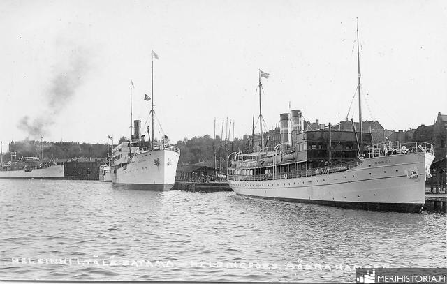 Fartyg vid kajen från nuvarande Olympiaterminalen (t.v.) fram till platsen för “Treans magasin” och Lybeckskajen. Närmast kameran SS BORE I, bakom henne SS NORDLAND.