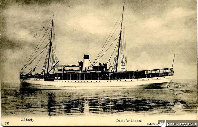 Kortet stpl Lybeck 7.5.1906 kl 4-5 N (Nachmittag?) till Fröken Bertha Forsius i Borgå med ankomststpl 9.5.1906 kl 12 e (eftermiddag?) med följande blyertsskrivna text: “19 6/5 06. Hälsningar från Östersjön! Nu borde vi vara ganska nära Svenska kusten. Vi ha haft härligt väder så vi ätit alla mål. Nu är det litet dimma, men nästan spegellungt. Till och med jag börjar förstå att det kan vara trefligt på hafvet. Många hälsningar från Elma.”