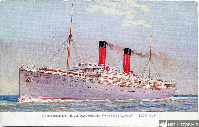 Bildsidans tryckta text: UNION-CASTLE LINE ROYAL MAIL STEAMER “ARMADALE CASTLE” 12.973 TONS. Adressidan: stpl 4.2.1913 på 1 d röd Georg V Transvaal från Alfred Docks, Cape Town (“Dear J, Hope you are well. We arrived here this morning. Kind regards W.A.“) till Miss J. Warden i Ramsgate, UK)