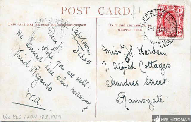 Se bild nr 368 Adressidans text: Dear J, Hope you are well. We arrived here this morning. Kind regards W.A. stpl 4.2.1913 på 1 d röd Georg V Transvaal från Alfred Docks, Cape Town till Miss J. Warden i Ramsgate, UK. Obs! Kortet flyttat 11.1.2002 till frimärkssamlingen, Sydafrika.